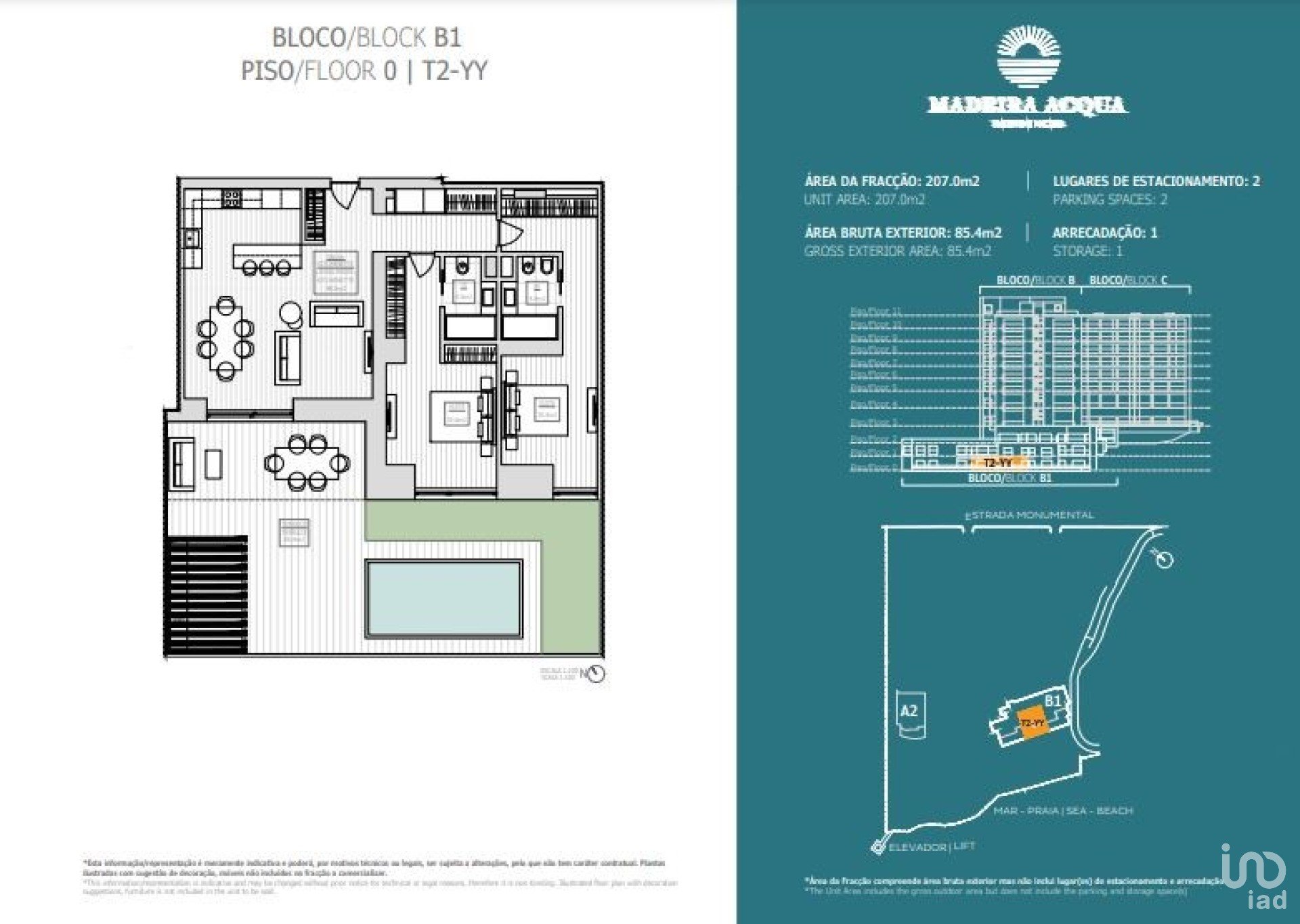 A sua fração tem área total de 207 m2, com área exterior de varanda de 85m2 e consta ainda com dois lugares de estacionamento.