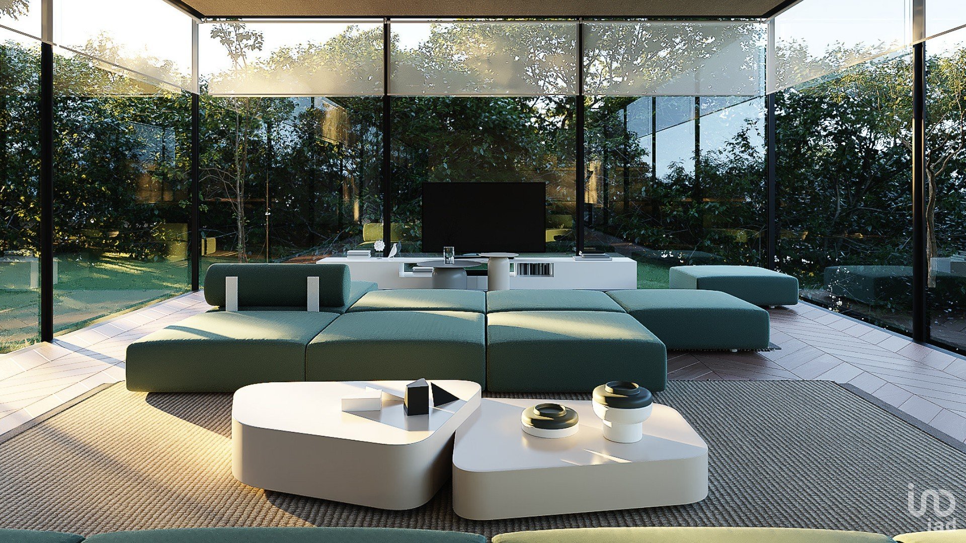 Vues panoramiques avec murs en verre et rideaux.