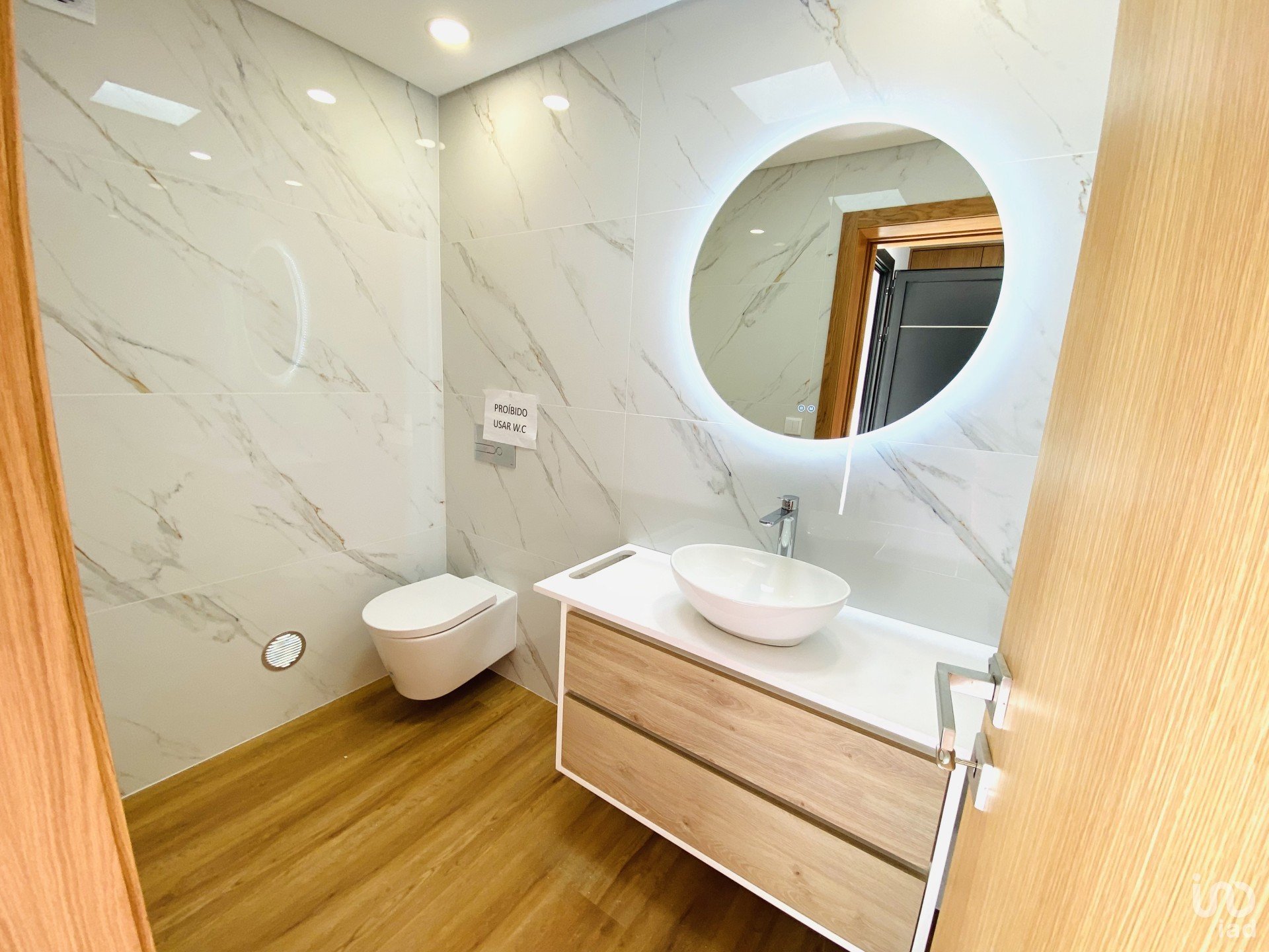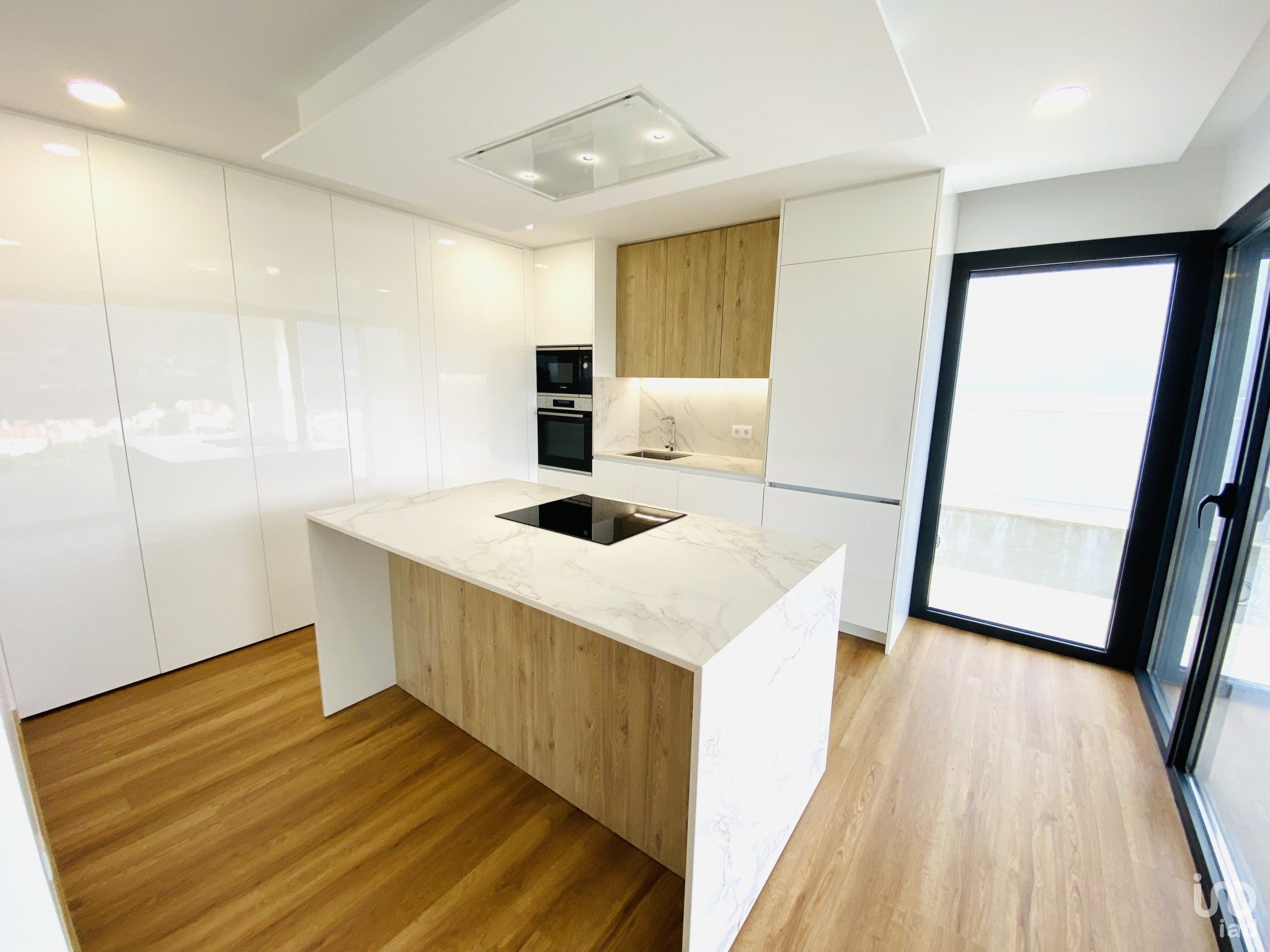 Toute la menuiserie est en bois laqué blanc, cuisine équipée de meubles et électroménagers, vaisselle de salle de bain suspendue, toilettes à chasse d'eau encastrées, placement d'Etic's (hotte) peint en blanc et gris foncé.
