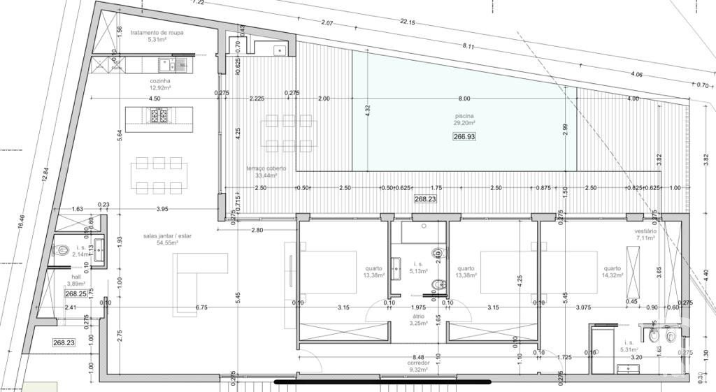 Composta por três quartos (um deles em suíte) e quatro casas de banho, esta propriedade destaca-se pelos seus acabamentos de alta qualidade e pela arquitetura que privilegia a luz natural e o bem-estar.