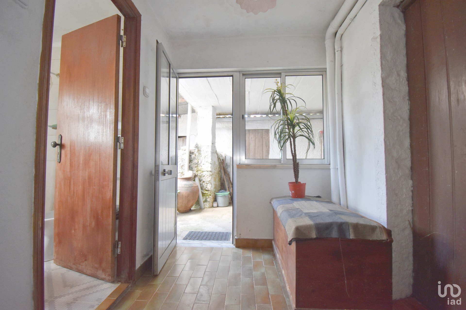Depuis la cuisine, nous entrons dans un hall qui donne accès à une salle de bains complète et à une sortie vers les annexes composées de trois bâtiments destinés au rangement et à la cour.