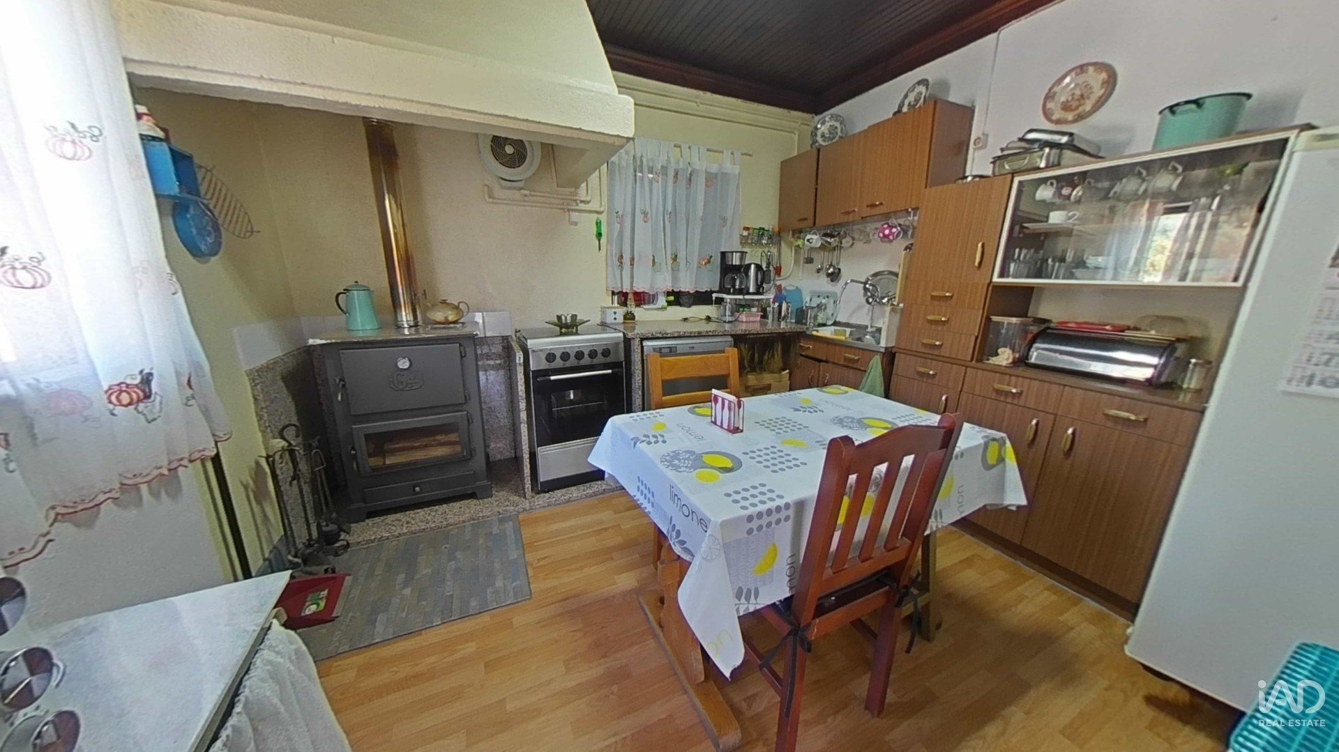 Cuisine avec cuisinière à bois pour le charme rustique et le chauffage naturel.