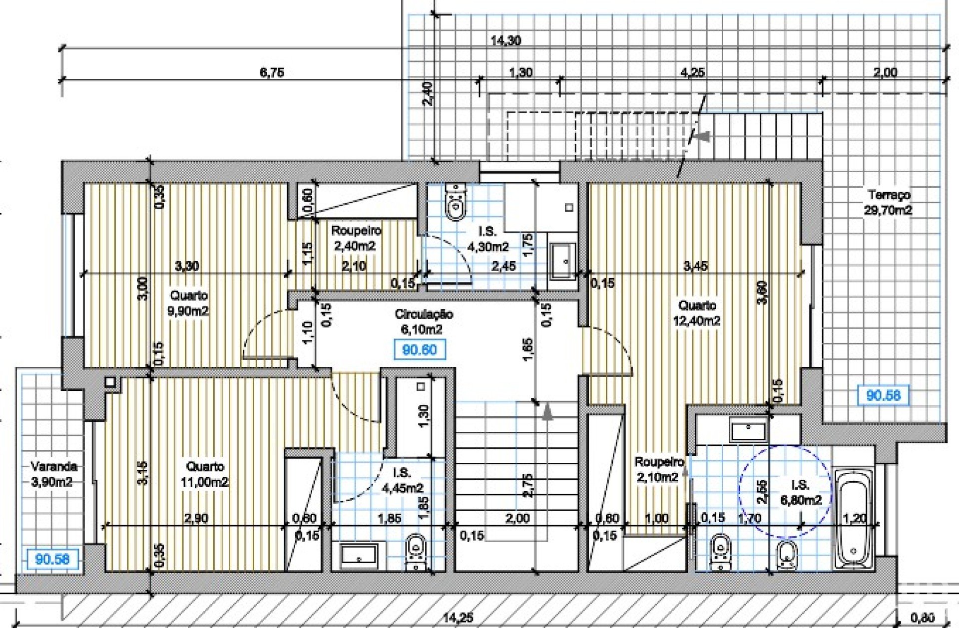 88.25 m2 ; 3 chambres avec chacune une sale de bain, et placards