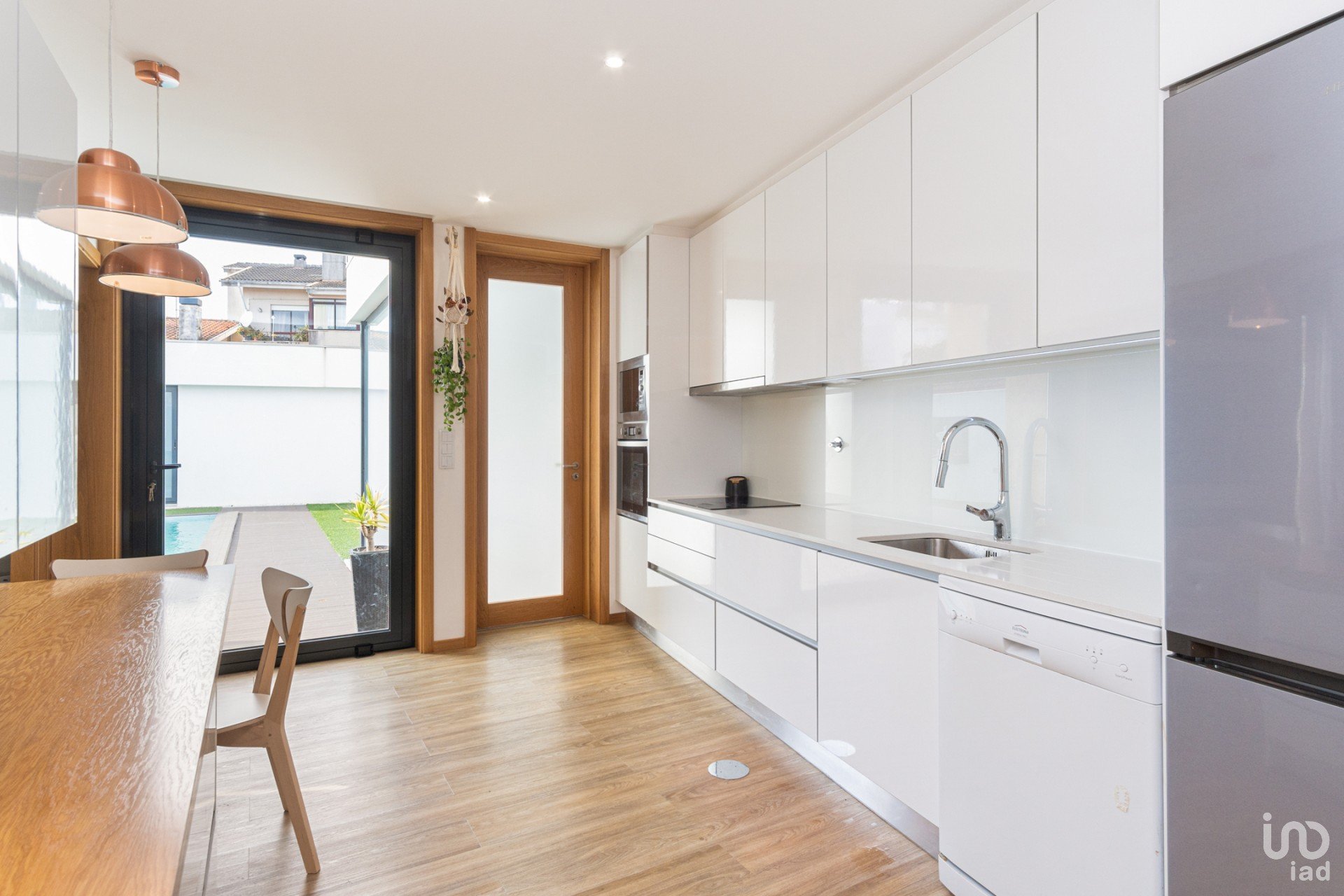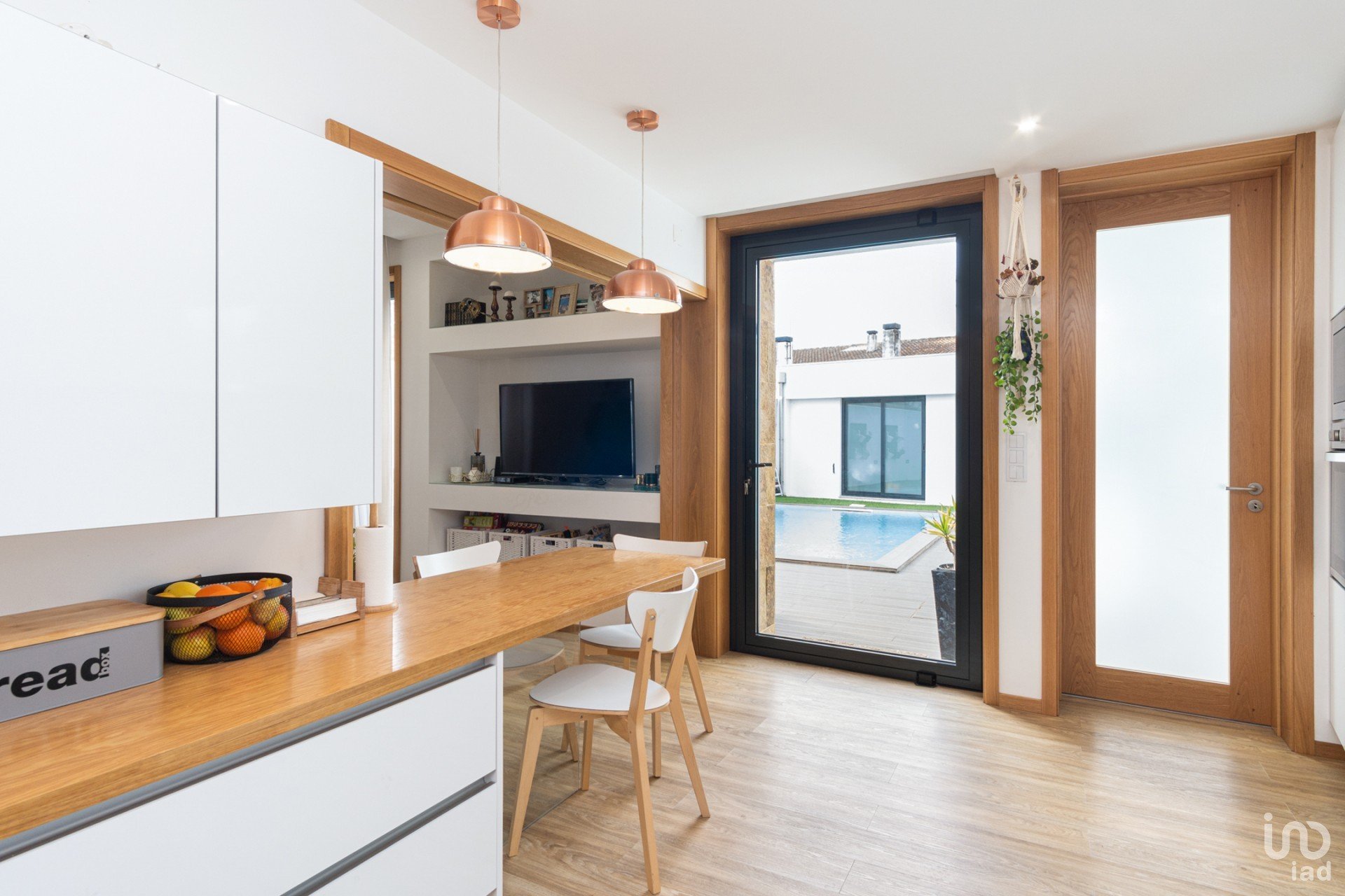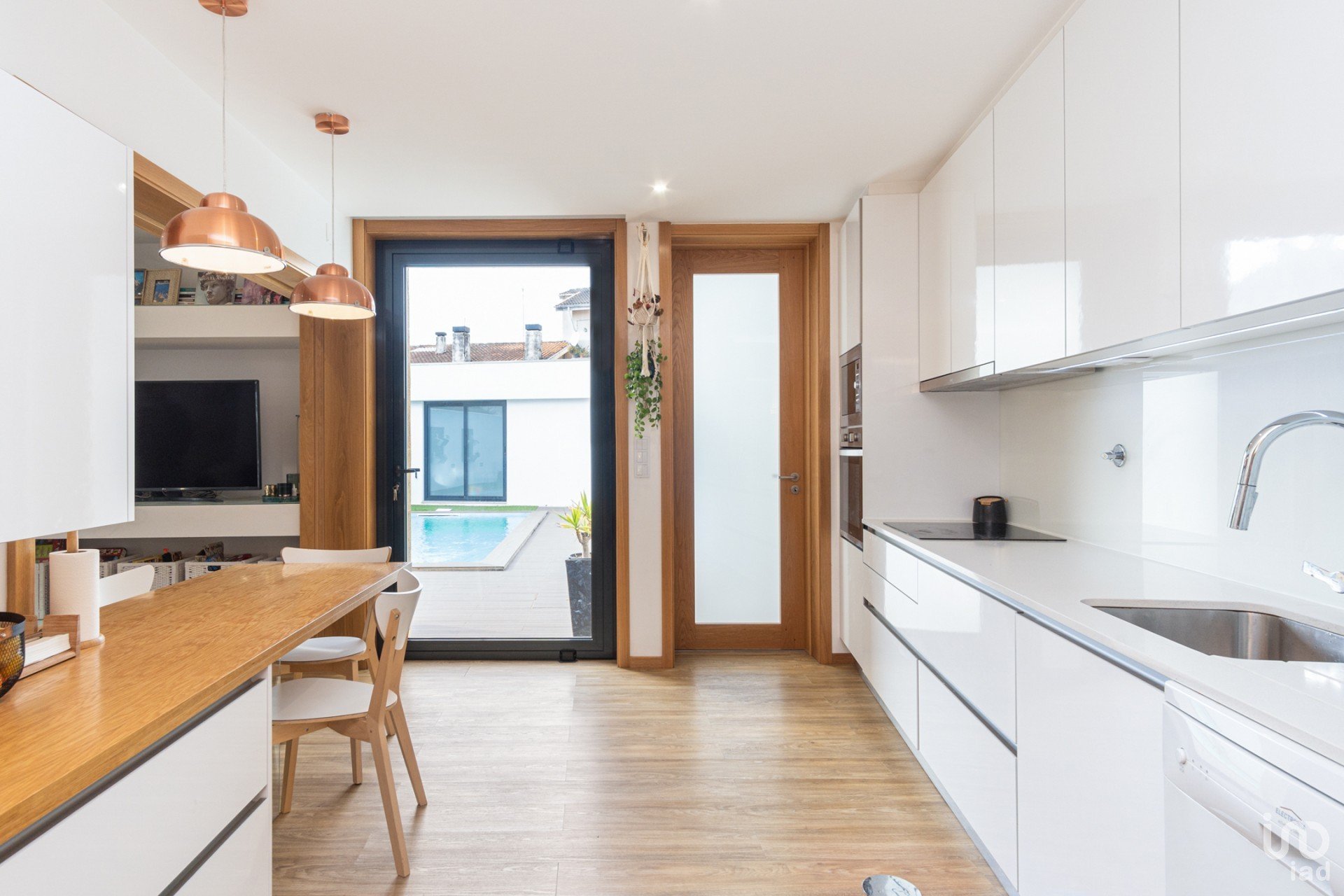 Le hall d'entrée donne accès au garage pour deux voitures, à la salle à manger, au salon à aire ouverte avec la cuisine, mais qui peut être fermé, à la cuisine, qui est entièrement équipée et donne accès à un magnifique espace extérieur où vous retrouvez la piscine, une cuisine extérieure, qui offre d'excellents moments de convivialité en famille et entre amis, une salle de bain et un espace de rangement.