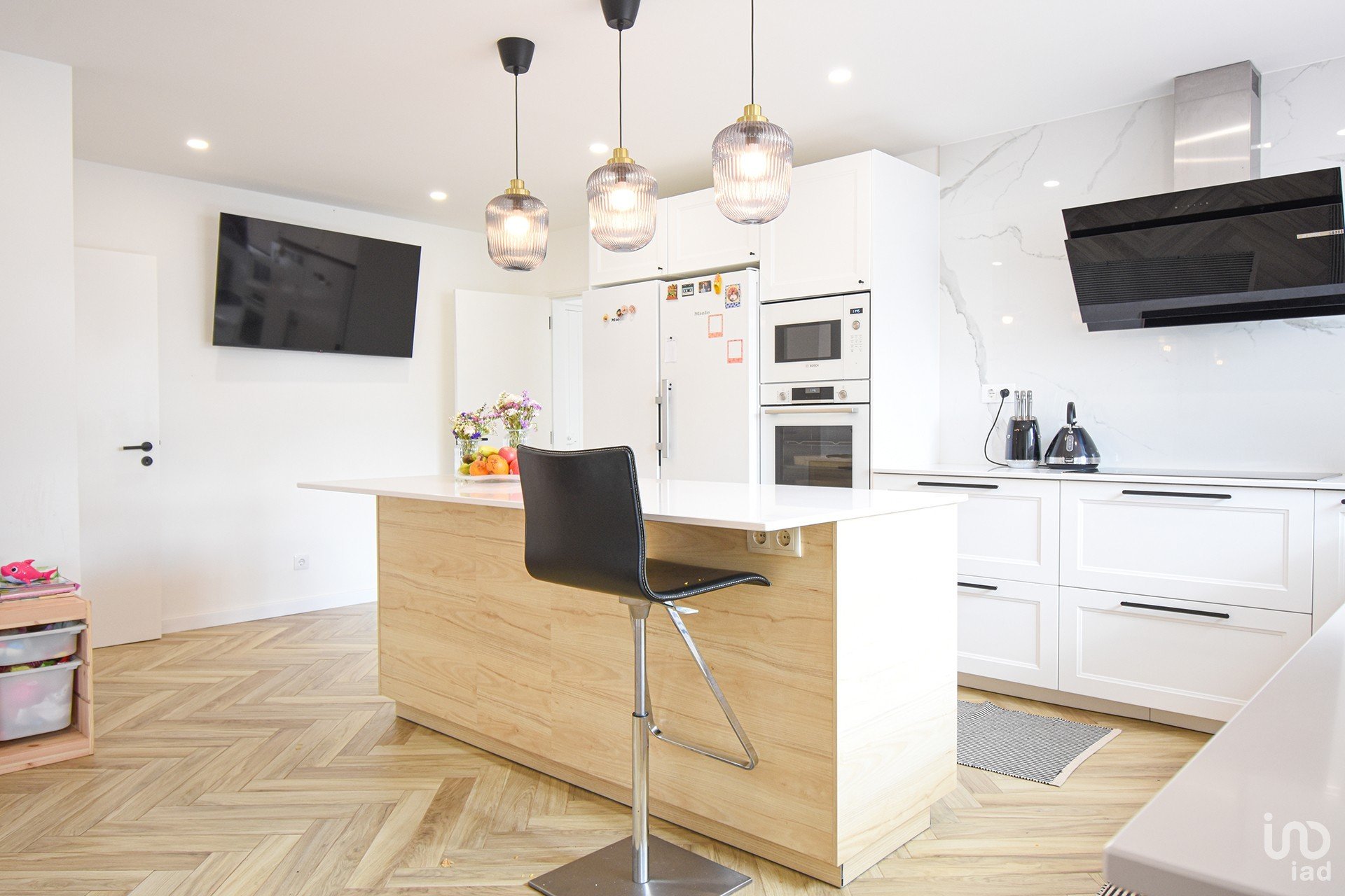 Au rez-de-chaussée, vous êtes accueilli par un salon spacieux de plus de 50 m2 avec beaucoup de lumière naturelle, offrant une sensation de sérénité dès votre arrivée. Le hall d'entrée mène à une cuisine de 28m2 avec îlot, entièrement équipée avec des appareils de haute qualité, idéale pour les amateurs de cuisine. Cet étage comprend également une chambre/bureau de 16 m2 et une suite de 20m2.