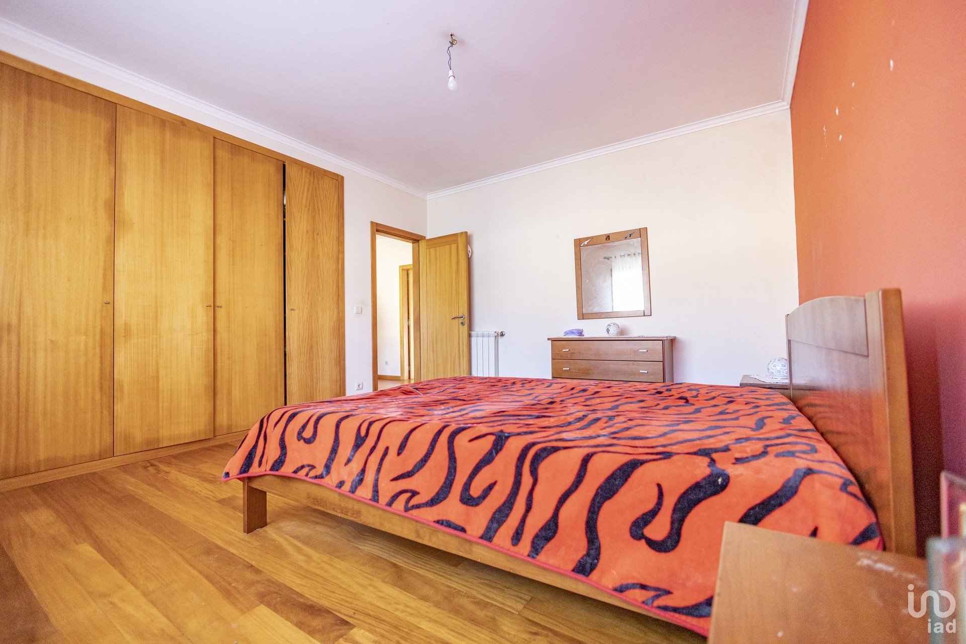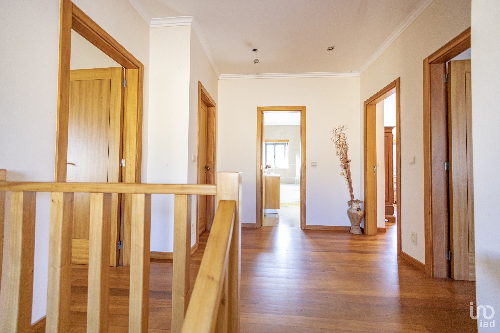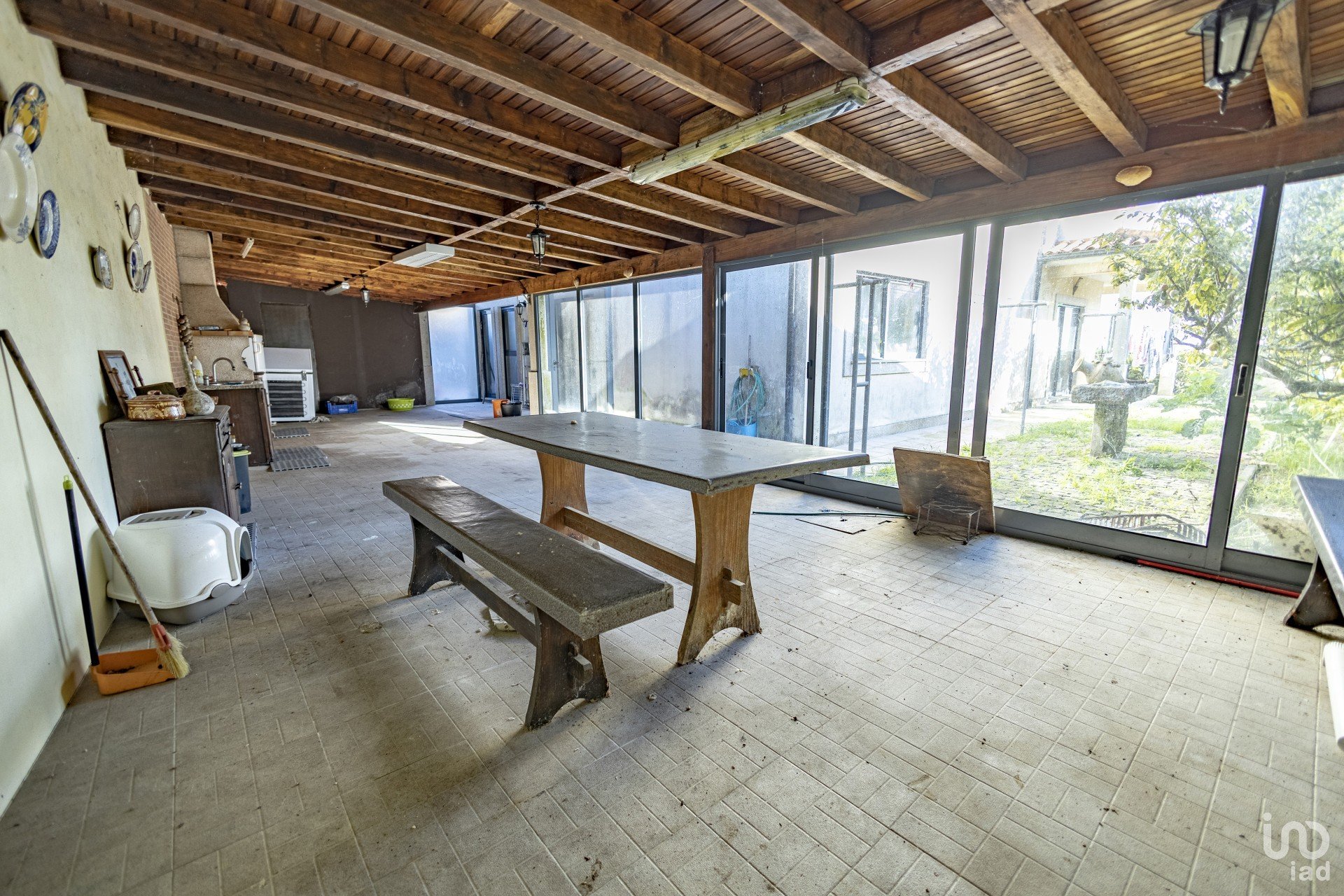 Distribuída por dois pisos, esta moradia é composta por cinco quartos, um no rés-do-chão e quatro no andar superior, sendo um deles suíte, cozinha ampla, despensa, lavandaria, churrasqueira e garagem.