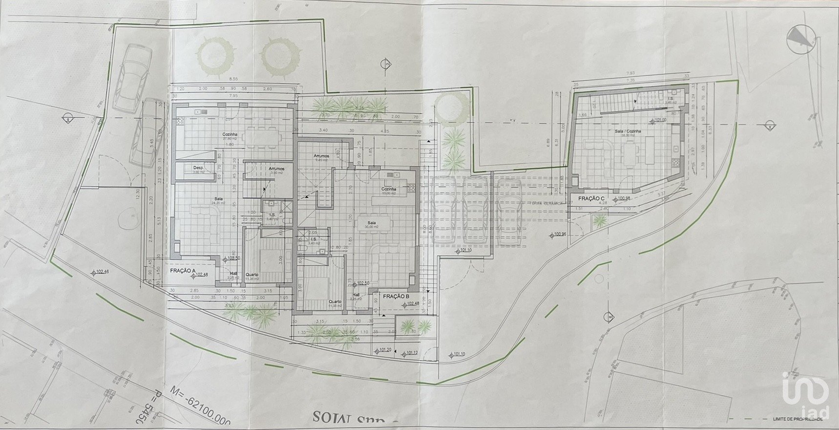 Je vous présente un terrain de 725 m², qui permet la construction de 3 maisons de plain-pied et à 1 étage, de type T2, T3 et T4.